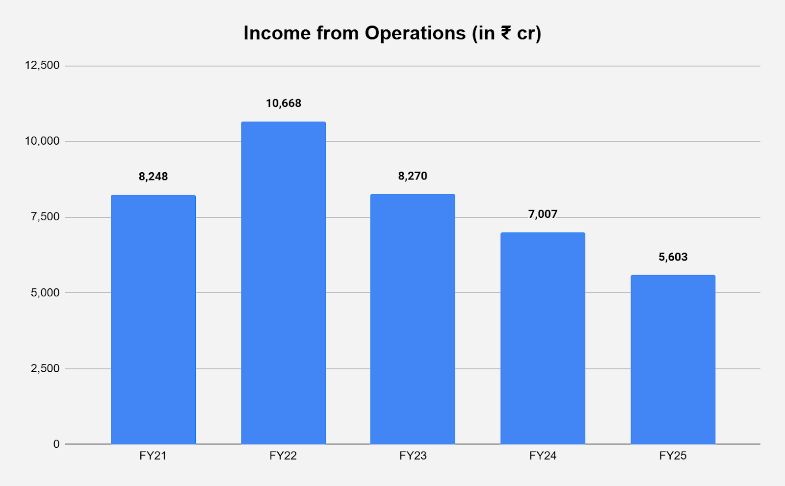 In FY25, HCC’s income from operations declined 20% to ₹5,603 crores from ₹7,007 crores in FY24. The revenue has been on a declining trend since FY22.