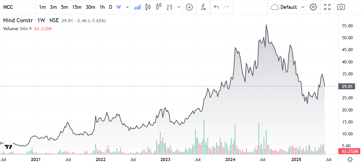 HCC share price has delivered an annualized return of 43% over the last five years. It rose from ₹6.45 per share in June 2020 to currently trading around the ₹30 level (19th June 2025). The 52-week high level of HCC share price is ₹57.50.