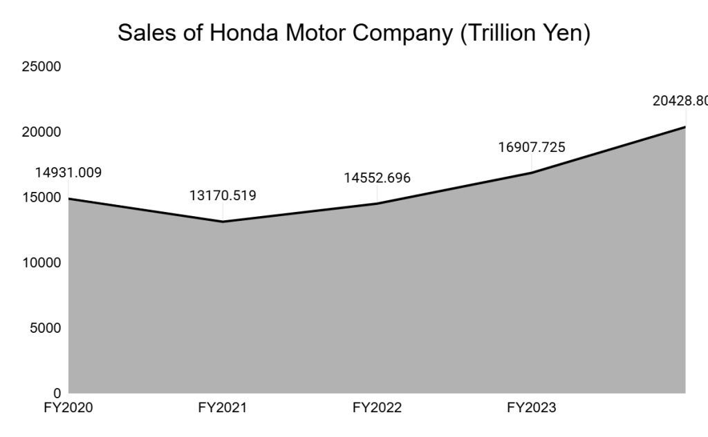 As of FY2024, the company’s sales touched 20428.8 trillion yen. The increase in sales volume, fueled by strong demand for hybrid (HEV) models in North America and motorcycles in India and Brazil, directly contributed to the subsequent growth in profit.