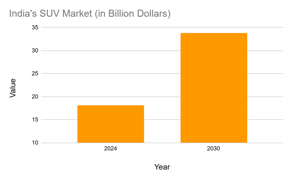 The Indian SUV market is projected to more than double, growing from $18.13 billion in 2024 to a substantial $33.85 billion by 2030. This indicates a strong and sustained growth trajectory for the segment.