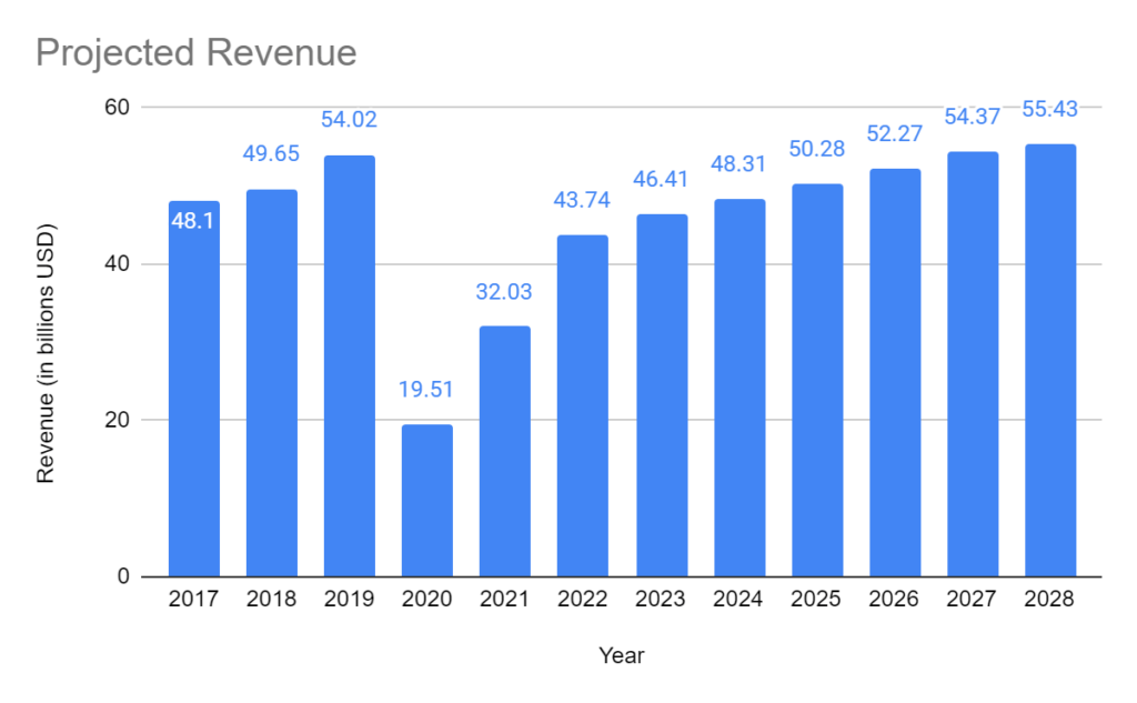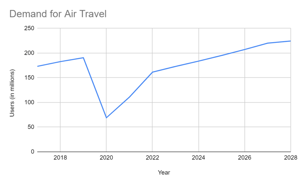 The competitive pricing strategies of LCCs have also spurred a price war, leading to more affordable air travel across the board. This can also be seen in the numbers while the projected demand is rising high, the revenue for the airline industry is not changing much.