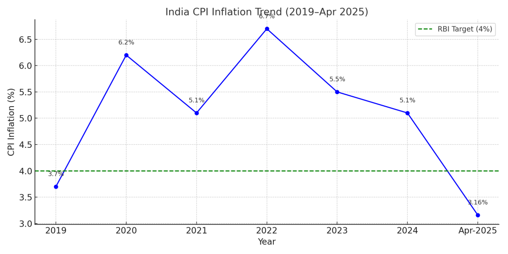 India’s retail inflation, as measured by the Consumer Price Index (CPI), eased to 3.16% in April 2025, marking its lowest level since July 2019. This decline from 3.34% in March 2025 is primarily attributed to a significant drop in food prices, especially vegetables, cereals, and pulses.