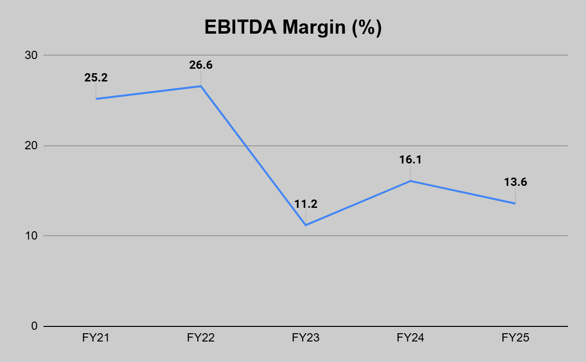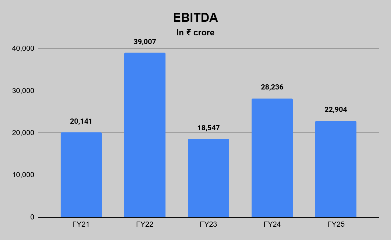 In FY25, EBITDA declined by 19% on a year-on-year basis to ₹22,904 crores from ₹28,236 crores. The decline in EBITDA is due to lower sales realisation on account of moderate steel prices and lower EBITDA from Bhushan Power & Steel.