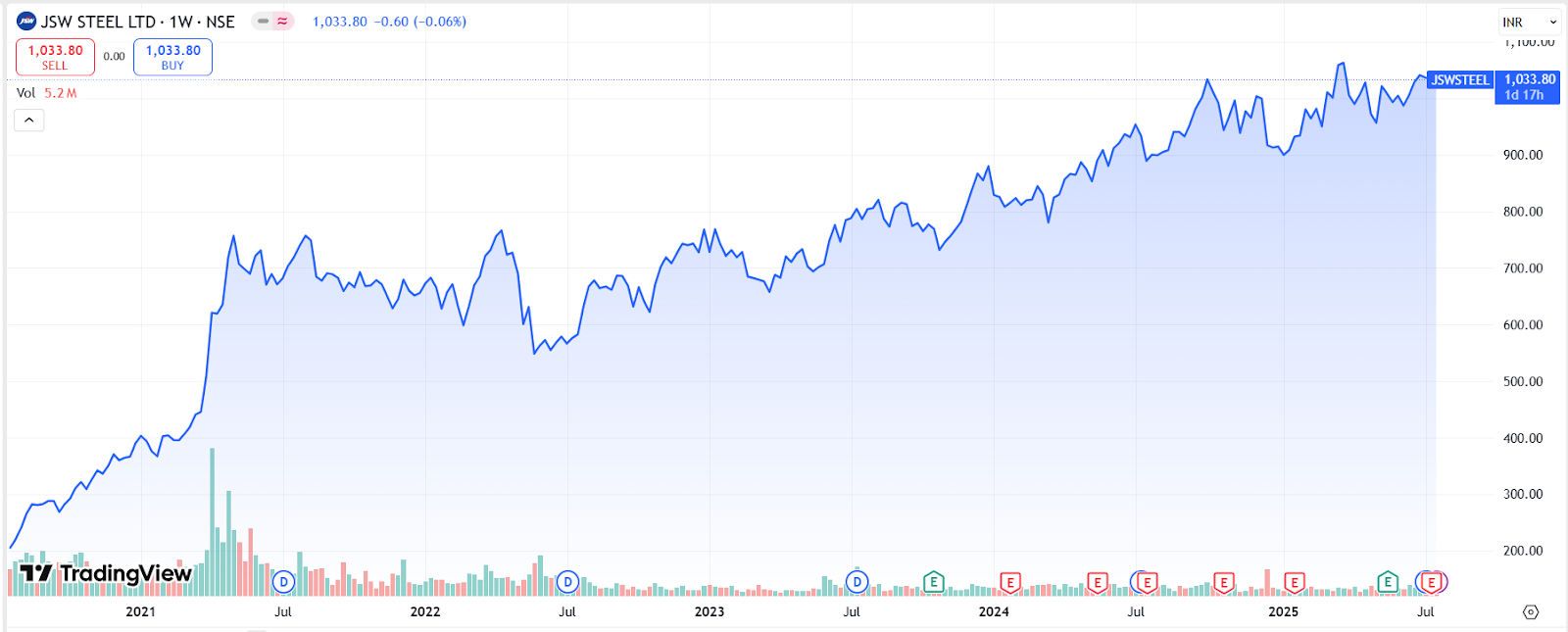 In the last five years, JSW Steel share price has increased from ₹205 (21st July 2025) to ₹1,031 (23rd July 2025), a rise of almost 405% in 5 years. Its 52-week high level is ₹1,075.