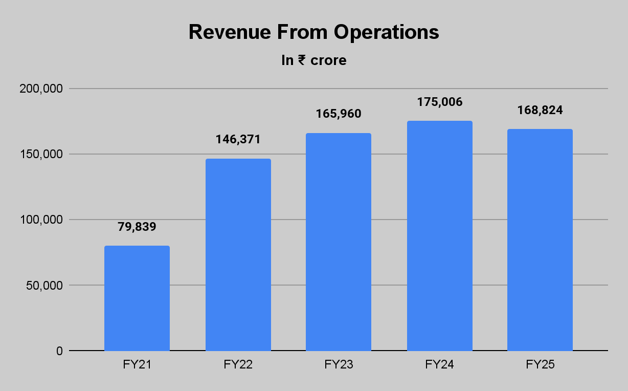 In FY25, the company’s revenue from operations declined by 3.5% year-on-year to ₹1,68,824 crores.