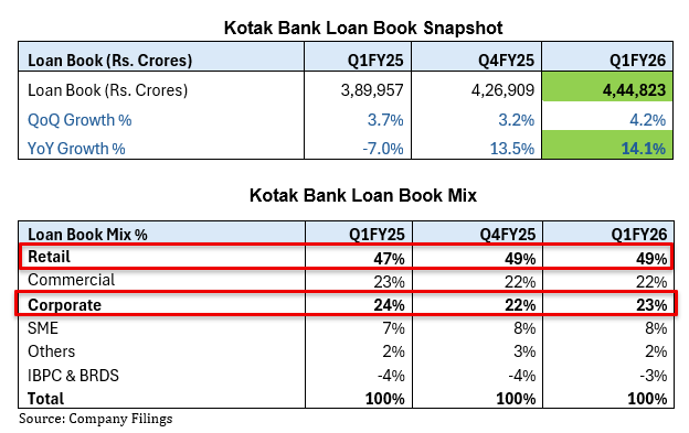The bank’s loan book grew 14% year-on-year, reaching ₹4.4 trillion. However, this growth was largely driven by corporate and home loans — segments that typically carry lower yields and hence offer thinner margins.