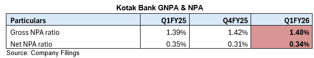 Kotak Bank’s management has also indicated that margin pressure may continue into Q2, as the full impact of repo rate cuts plays out. However, margins are expected to gradually stabilise and improve, aided by internal cost efficiencies and benefits from lower CASA rates.