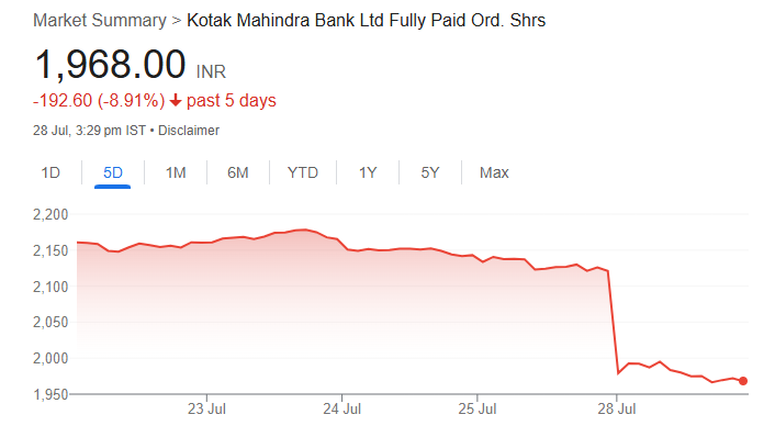 In early trade today, Kotak Mahindra Bank share price fell 5% after investors digested the bank’s earnings that it reported over the weekend.