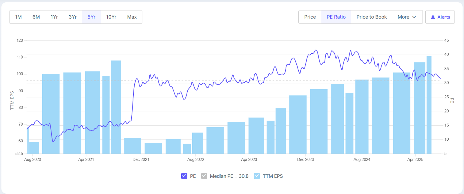 L&T stock is trading at a PE of 31.5 times, meaning, for every ₹1 of earnings, you are paying ₹31.5 as a premium.