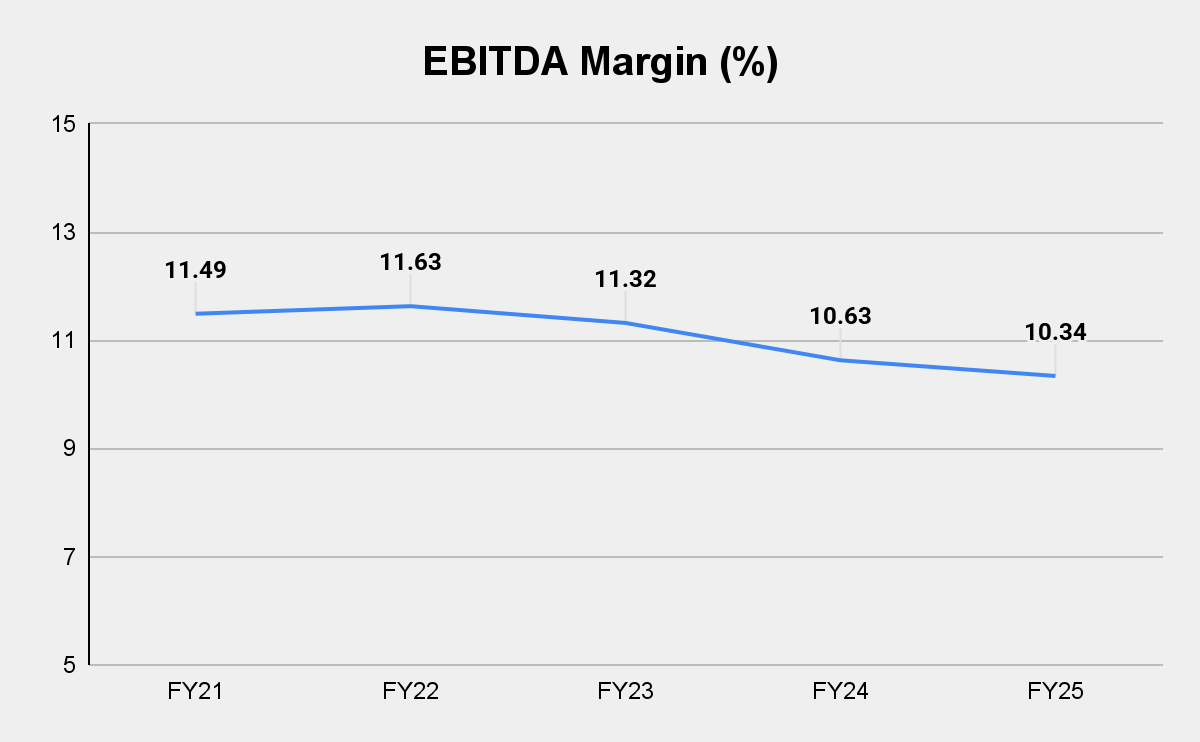 Looking at the trend of EBITDA margin, it is on a slight declining trend. The margin has declined from 11.49% in FY21 to 10.34% in FY25, a fall of 105 basis points.