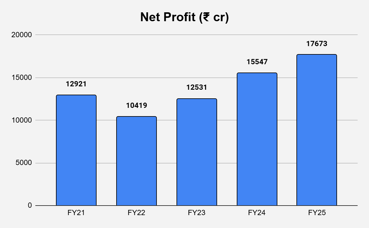 Barring FY22, the net profit of L&T has been consistently rising over the five-year period. In FY25, the net profit increased 13.7% to ₹17,673 crores from ₹15,547 crores in FY24.