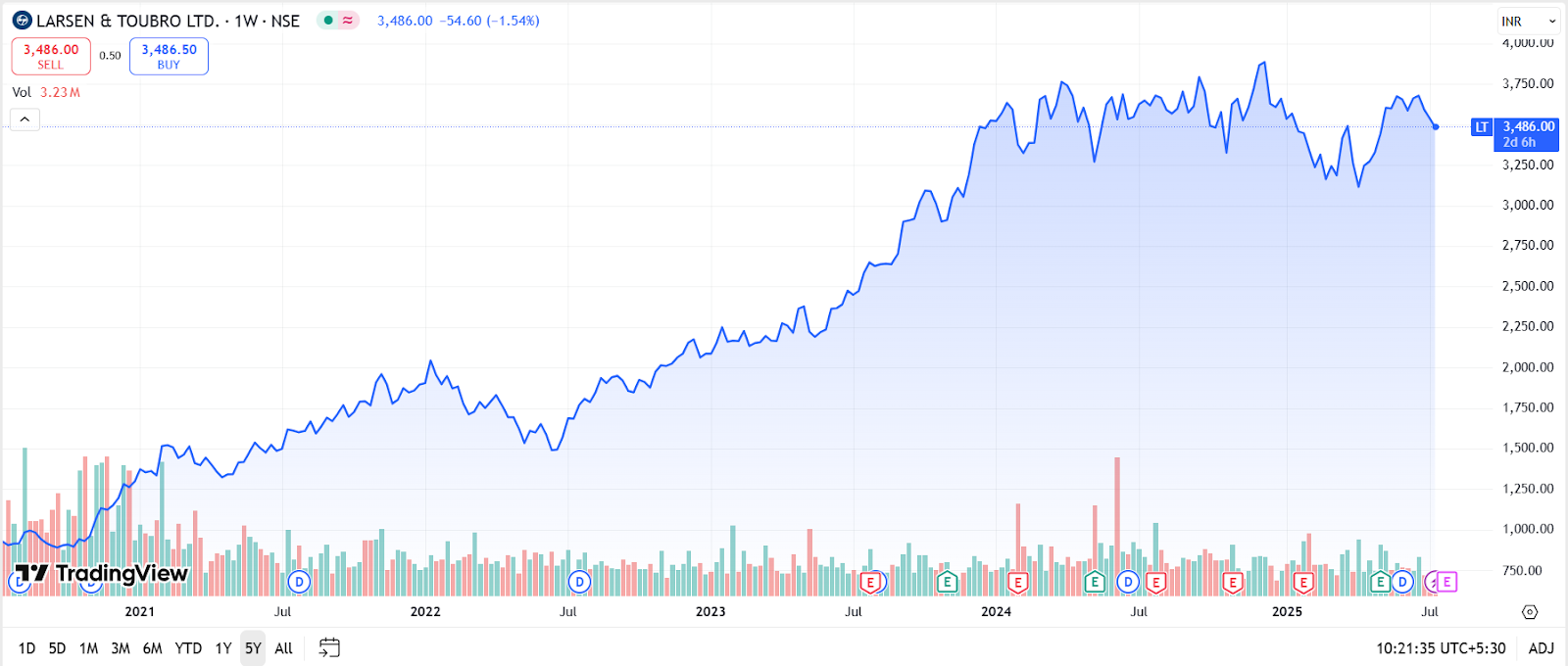 Over the last five years, Larsen & Toubro share price has become a multi-bagger, rising from around the ₹900 level in July 2020 to currently trading at the ₹3,480 level (15th July 2025).