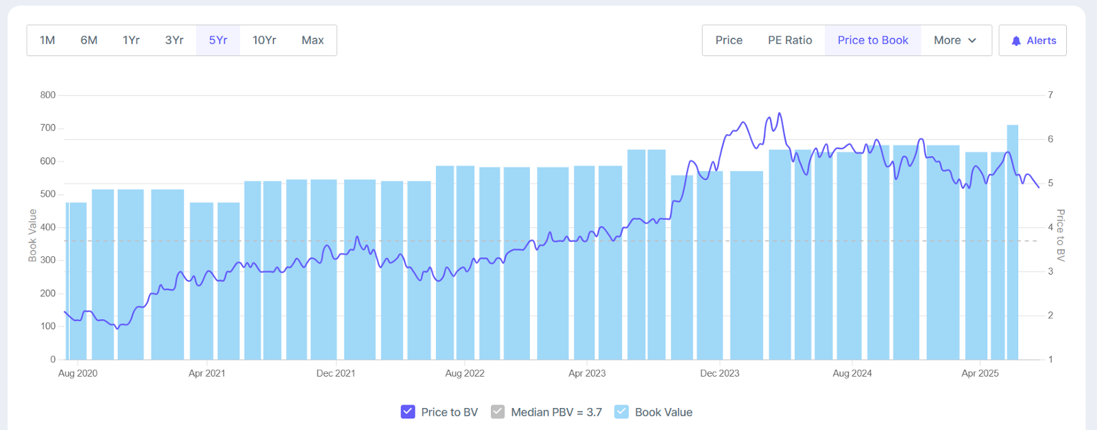 The 5-year median price-to-book value is 3.7 times, largely indicating the stock is trading at a sight premium compared to its historical valuation.