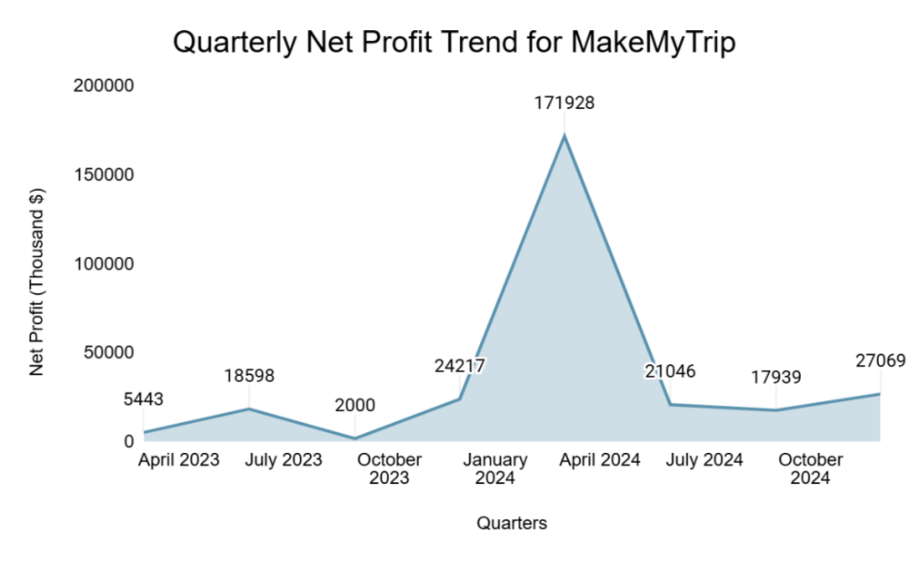 MakeMyTrip has seen an overall increase in the quarterly net profit, with the latest increase being 11.8% y-o-y as of the December 2024 quarter. The sudden spike in the profit in the March 2024 quarter happened because the company achieved its highest-ever annual gross booking, witnessed high repeat rates, and optimized tech costs due to a unified back-end Infrastructure.