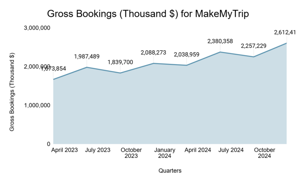 MakeMyTrip’s hotel and package business grew by 17.2%, reaching $147.1 million for the quarter, up from $125.5 million in 2023. This growth was driven by a 21.9% rise in gross bookings, fueled by more hotel room nights being booked as travel both within India and internationally increased.