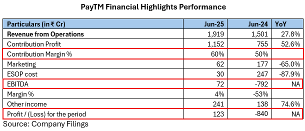 Paytm’s operating costs were tightly managed. A reduced share of DLG loans helped cut costs significantly. As a result, contribution profit jumped 52%, with contribution margin improving to 60%.
