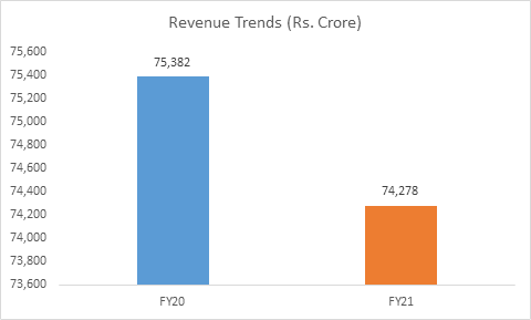 • Maruti Suzuki’s revenue in FY21 decreased to Rs 70,332 crore from Rs 75,610 crore in the previous year.