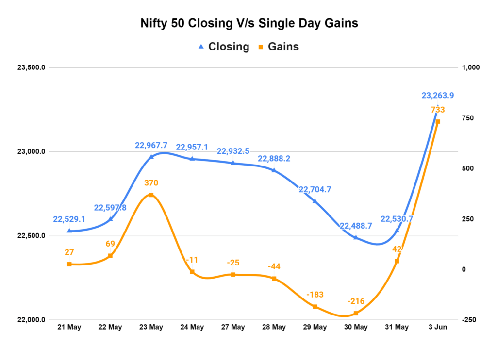 When did you remember that the stock market felt particularly energetic? Yesterday, on June 3rd, the Sensex and Nifty surged to new highs, marking the strongest single-day gain in over three years. Unbelievable, isn’t it? Could it be the anxiety of the election results today or something else?