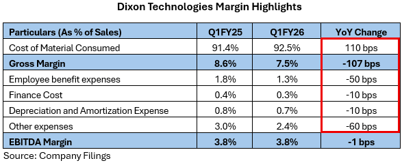 The company’s Mobile & EMS division led the performance, with revenue growing 125% YoY. This segment now contributes 91% to total revenue, up from 79% in Q1 last year — clearly establishing itself as Dixon’s primary growth engine.